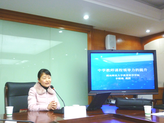 长沙外国语学校2015年寒假提升课程领导力研修活动之一 为提升学校管理团队对学校课程领导力的理解和认识,进一步增强学校课程管理工作的针对性和实效性,2月1日,我校特邀湖南师范大学教育科学学院教育学博士、博士生导师辛继湘教授为全体行政管理人员、教研组长、年级组长举行了题为《中学教师课程领导力的提升》的主题讲座,作为我校2015年寒假“提升课程领导力”主题研修活动的起航活动。